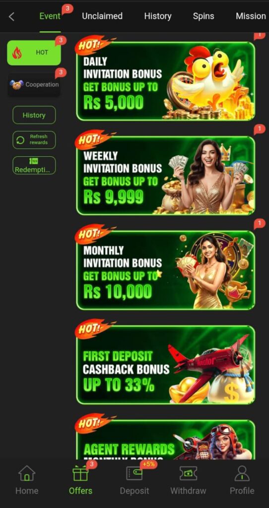 - Bonuses and Rewards: It includes features like daily login bonuses, referral rewards, and promotional offers to keep users active.